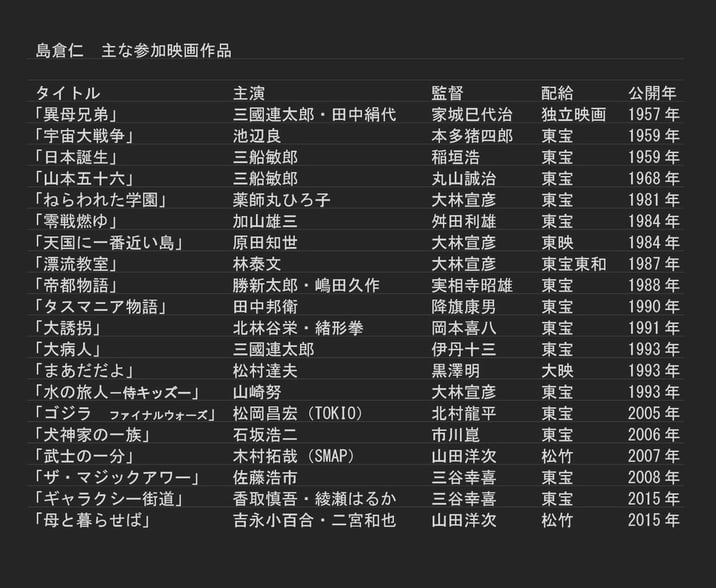 また、岡本喜八監督、市川崑監督のお別れのセレモニーでは背景装飾を手がけ、とくに岡本監督は「島倉さんの作品で送ってくれ」と遺言を残されたという。