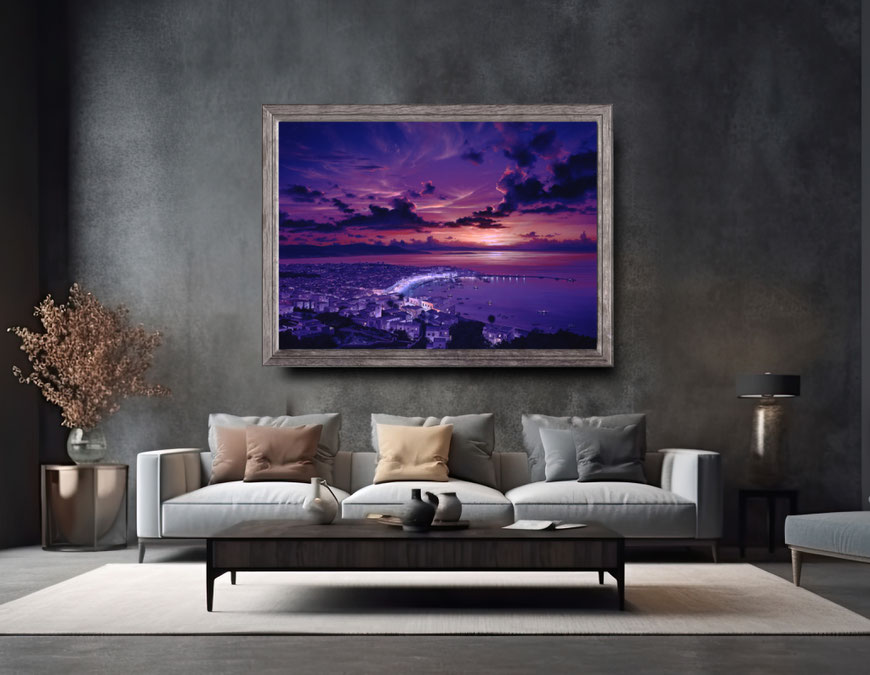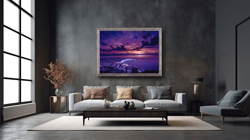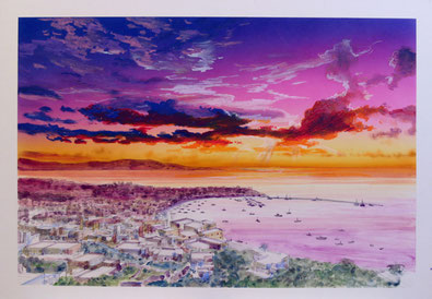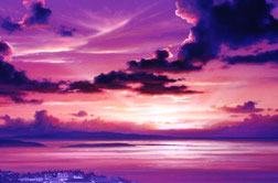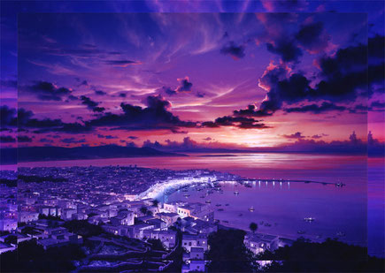 空は深い紫と紅に染まり、絵具を何層にも重ねてグラデーションを作っています。
