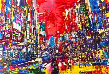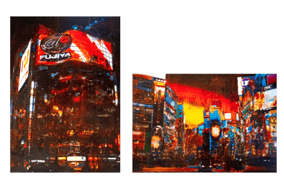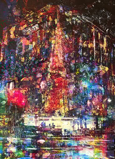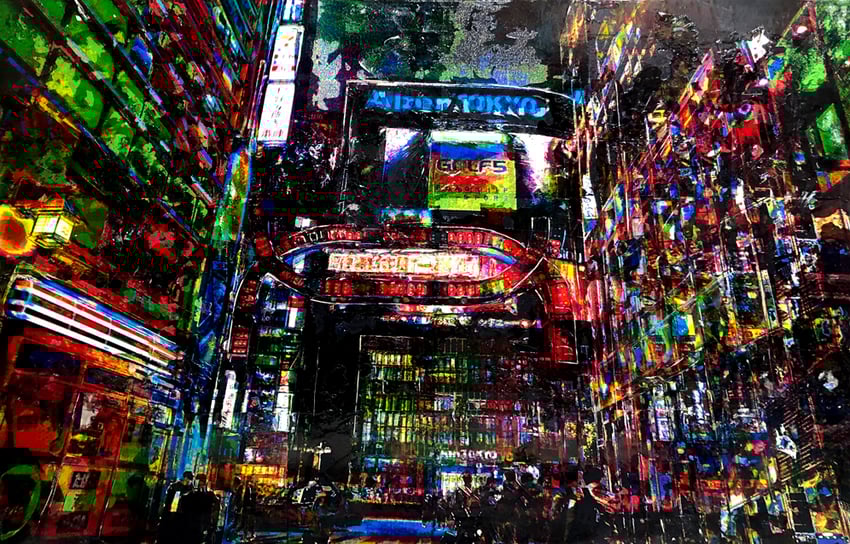 現代社会の複層構造を「都市の光景」で表現している栗原莞爾のマスターピース。その風景はまるで現代都市のパレットから抽出されたような色彩と動きを持っています。ネオンの輝きが街を照らし、人々の心を魅了します。建物の壁面には無数の看板が並び、まるで抽象画のよう。