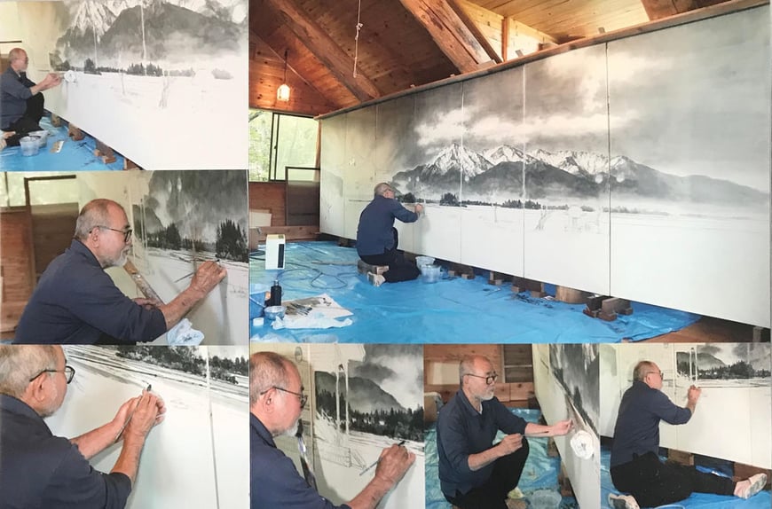 同寺への奉納は、二回目で、前回は、チベットから中国へと流れる仏教の伝来をを表現いたしました。今回、新潟の山々や寺社周辺の風景を描きました。合わせまして、全て完成いたしました。